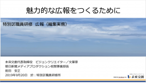 東京と特別区の職員研修「広報(編集執務)」に出講しました。「魅力的な広報をつくるために」と題して、「わかりやすく伝わりやすい文章」「校正・校閲の実践アドバイス」「見出しの付け方」「多様性を見据えたことば」などについて、3時間半お話ししました。