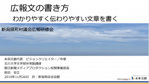 新潟県町村議会議長会の広報研修に出講しました。「広報文の書き方 わかりやすく伝わりやすい文章を書く」と題してお話と、広報のクリニックをしました。みなさん、熱心にお聞きくださり、頭の下がる思いがしました。 (2019年11月26日)