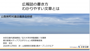 山梨県の町村議会の議会広報誌のクリニックなども含めて、お話ししました。議会広報は、議会のお知らせだけでなく、議員の活動報告という側面も持ちつため、そのバランスが難しい。記事の書き方、写真の配置、見出しの付け方などが、課題だとのことでした。東京から特急「あずさ」で1時間半ほど。甲府はとても好きな町です。(2020年11月9日)